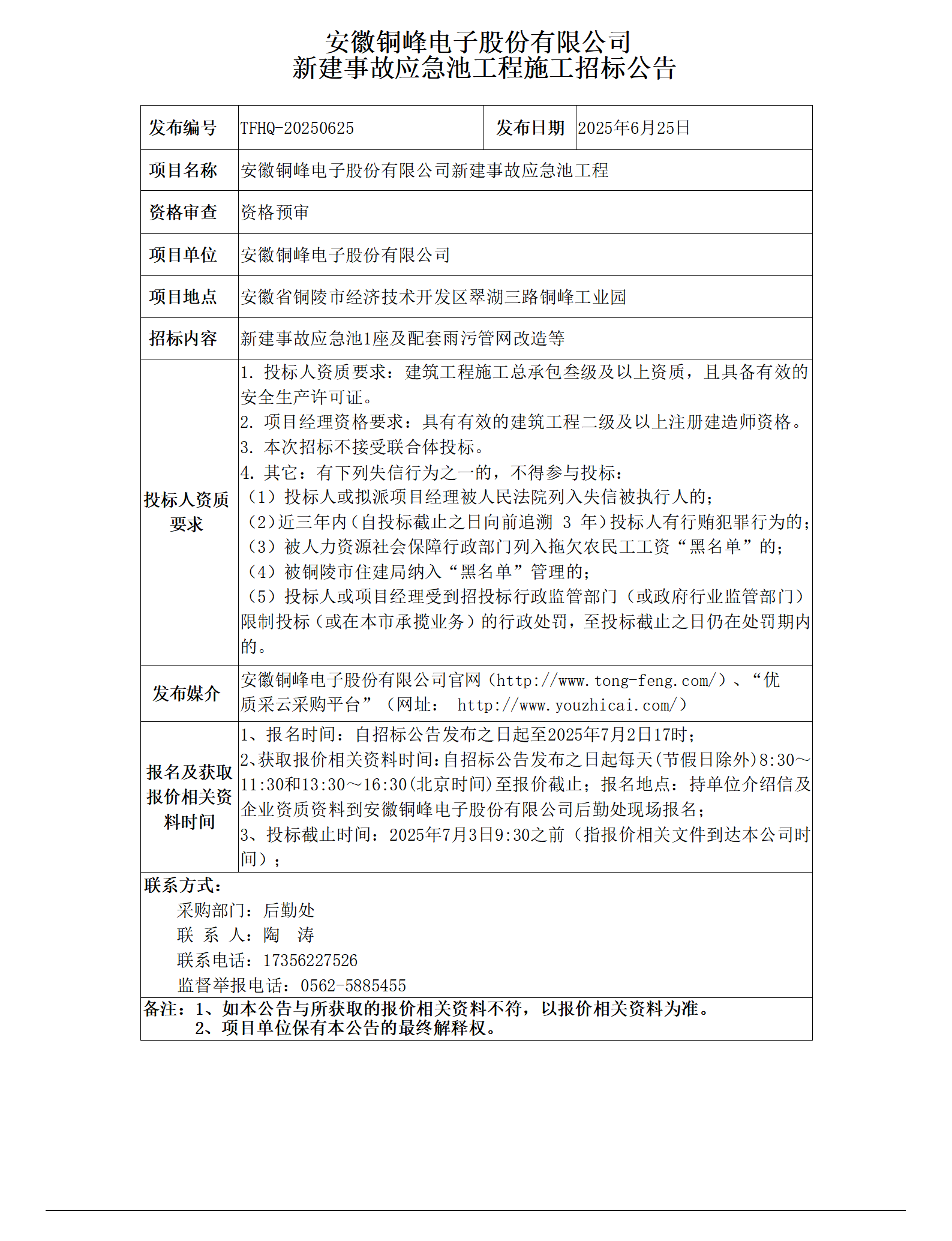 安徽銅峰電子股份有限公司 (銅峰電子事故應(yīng)急水池工程招標(biāo)公告)_01