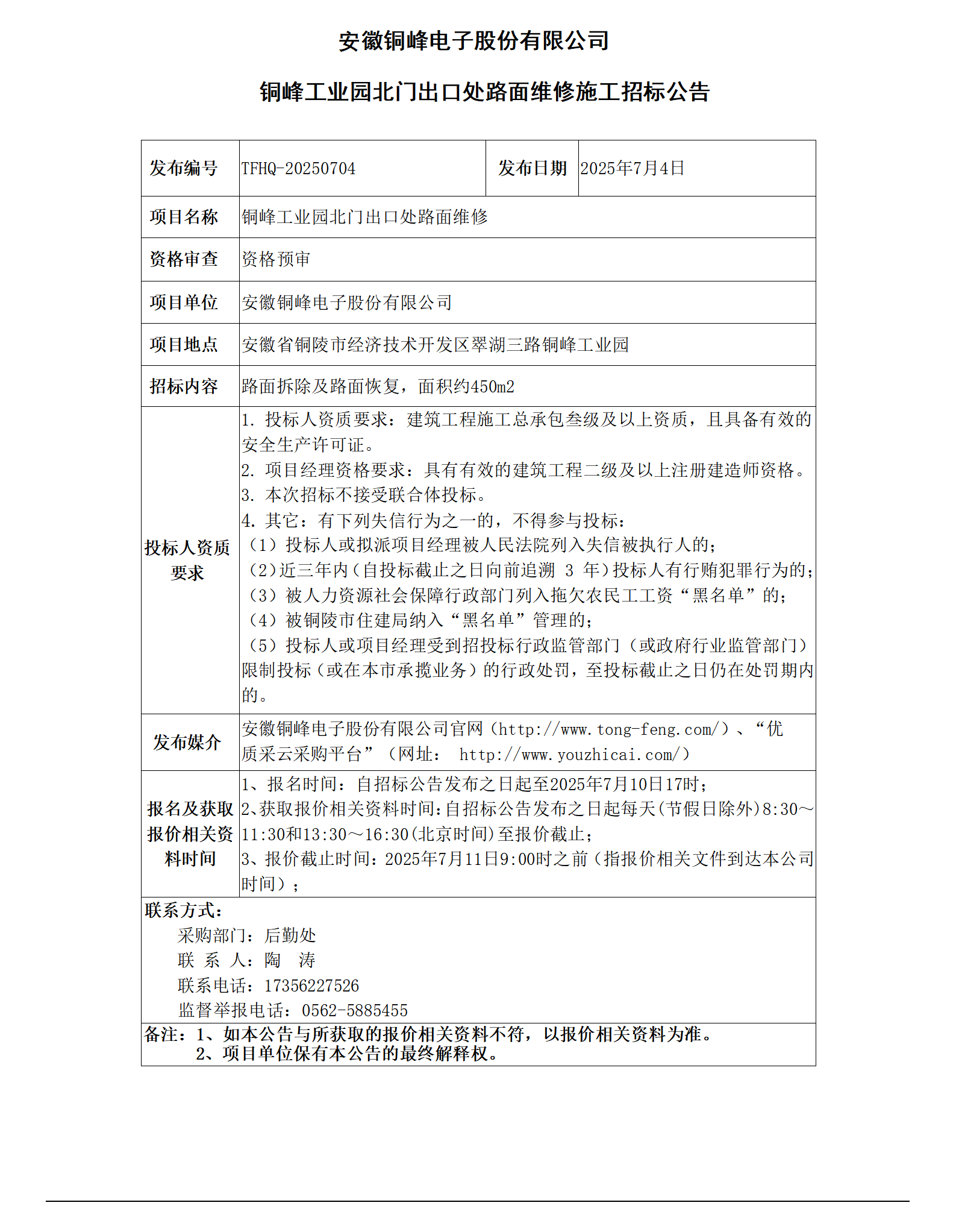 安徽銅峰電子股份有限公司 (銅峰工業(yè)園北門出口處路面維修招標公告)_01